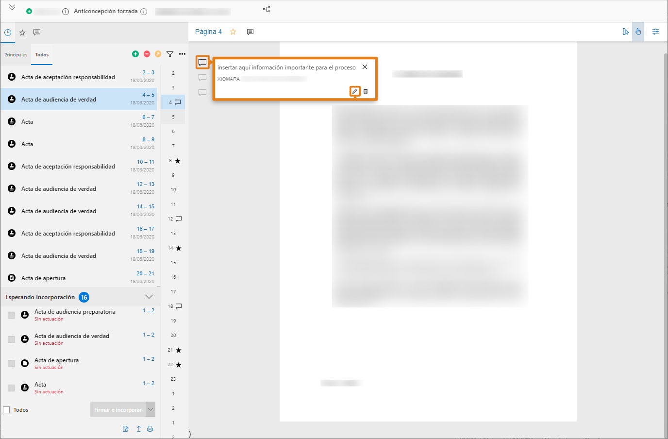 1. Con el expediente del proceso abierto en la visión cronológica (1), ubique en la regla de paginación el comentario que desea editar. El ícono de apuntes