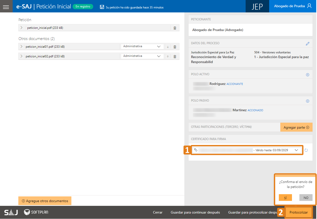 12. Para finalizar la petición inicial, seleccione el Certificado para Firma (1). En seguida, haga clic en Protocolizar (2) y haga clic en la opción Sí para confirmar el envío de la petición.