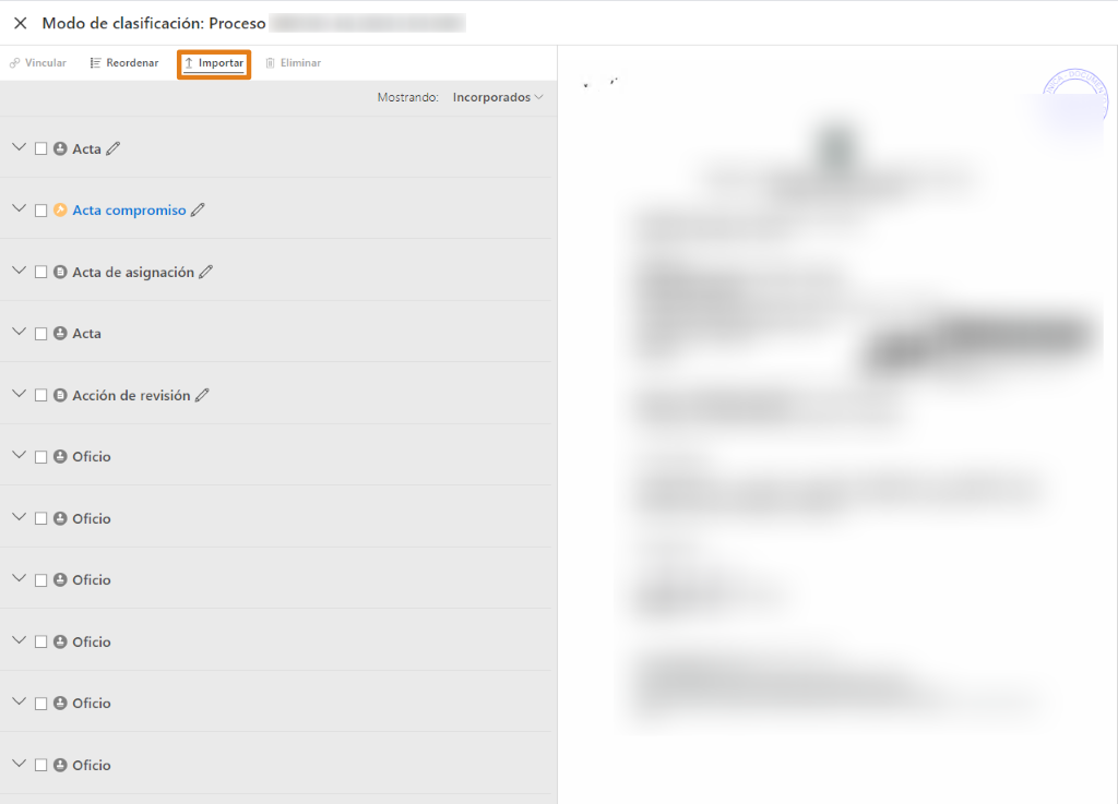 1. Para acceder a la funcionalidad Importar de la ventana Modo de clasificación, haga clic en el icono ubicado en la parte inferior del expediente digital del proceso.