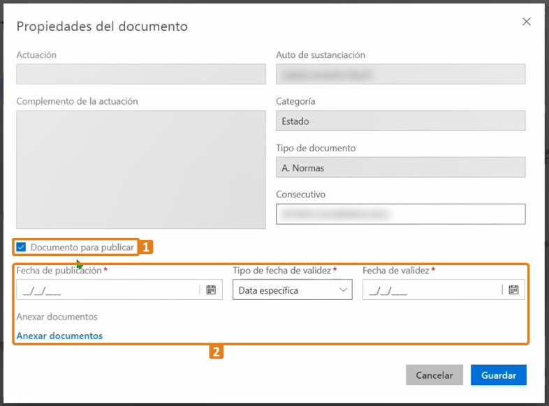 5. Después de informar un consecutivo válido, el campo Documento a publicar (1) se habilita. Seleccione esta opción. Si la sección de datos complementarios (2) se hace visible, el documento es publicable, además de ser posible insertar en él anexos.