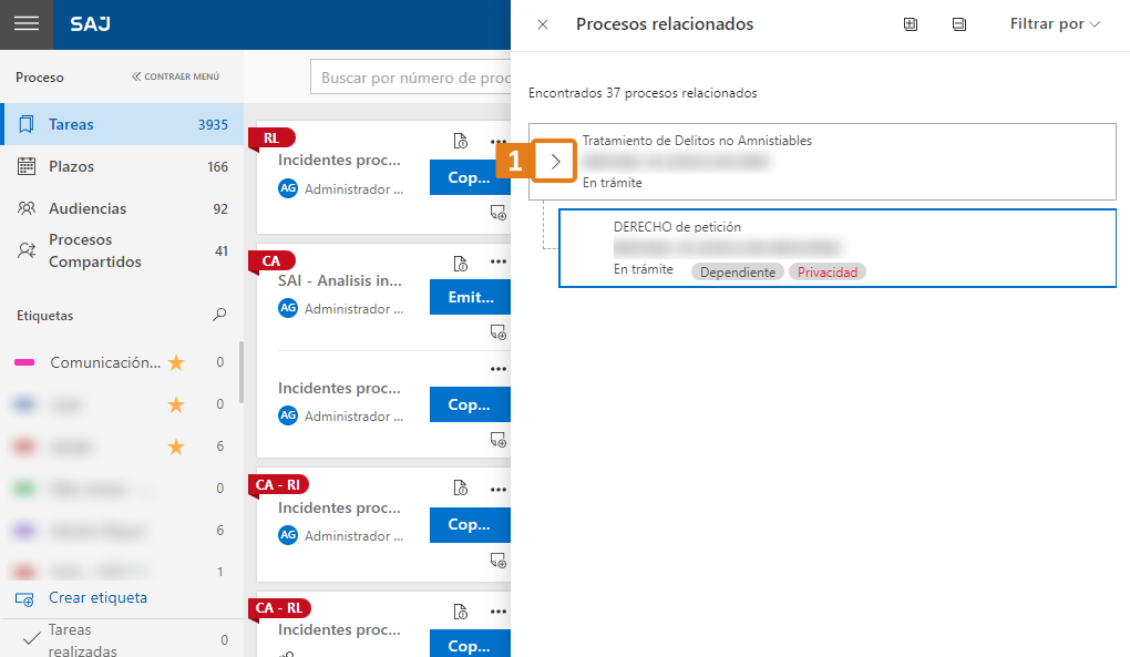 1. En la tarjeta del proceso seleccione el icono de Procesos relacionados (1) para abrir la pestaña: