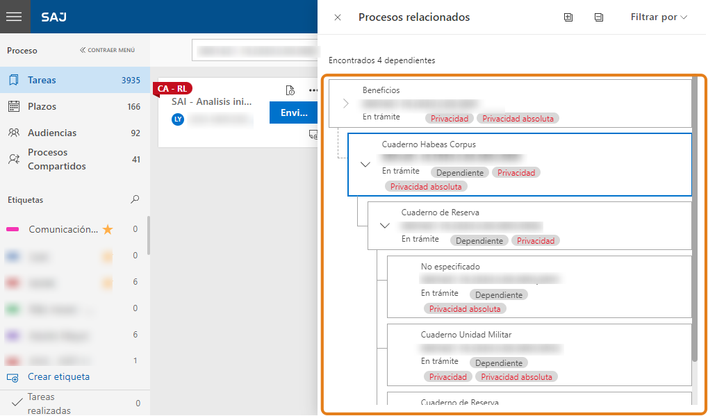 9. Seleccione el filtro dependiente y el sistema devuelve en la búsqueda solo los procesos incidentes relacionados al proceso seleccionado:
