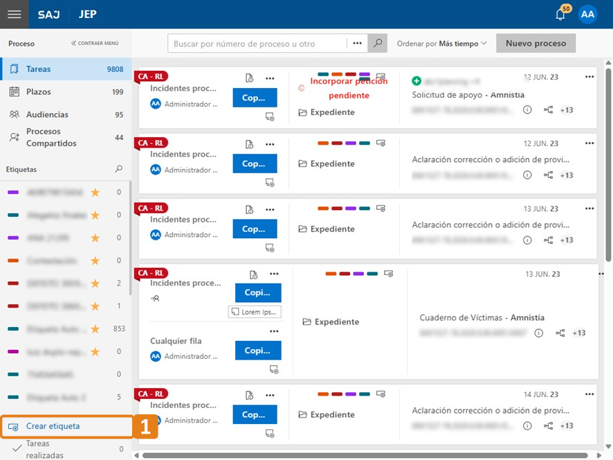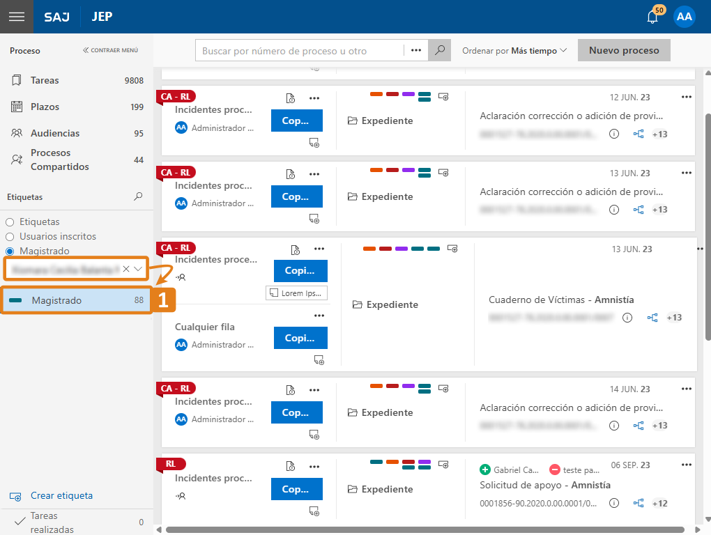 Paso 3. Después de aplicar el filtro por magistrado y visualizar las etiquetas, haga clic sobre la etiqueta deseada. El sistema mostrará, en el Panel de Tareas, solo los procesos relacionados con el magistrado configurado en la etiqueta seleccionada.