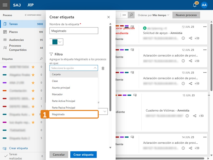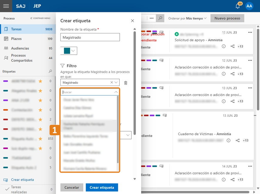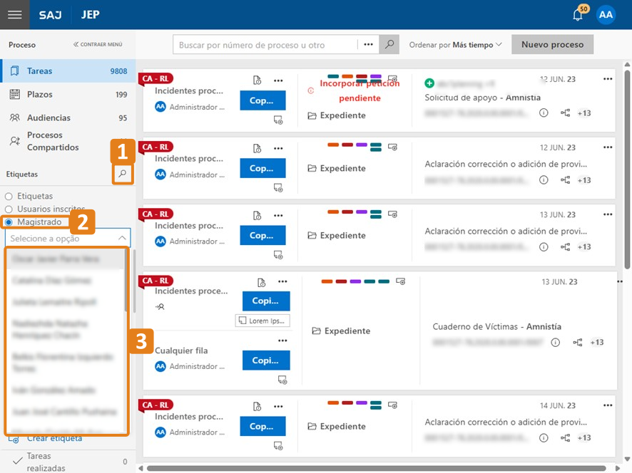Paso 1. Acceder a la búsqueda de etiquetas: En el Panel de Tareas, en la sección Etiquetas, haga clic en el ícono de búsqueda (1). Seleccione el filtro Magistrado (2) y seleccione un magistrado de la lista (3).