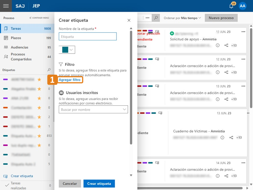Las etiquetas automáticas permiten organizar procesos en el Panel de Tareas de forma dinámica, según reglas previamente definidas y establecidas en los filtros. De esa manera, es posibble configurar etiquetas automáticas asociadas a magistrados, lo que facilita la identificación y organización de los procesos según su asignación.