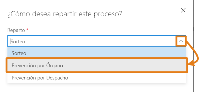 5. Por estándar, el sistema viene con la opción Sorteo seleccionada automáticamente, haga clic en Reparto y seleccione la opción Prevención por órgano.