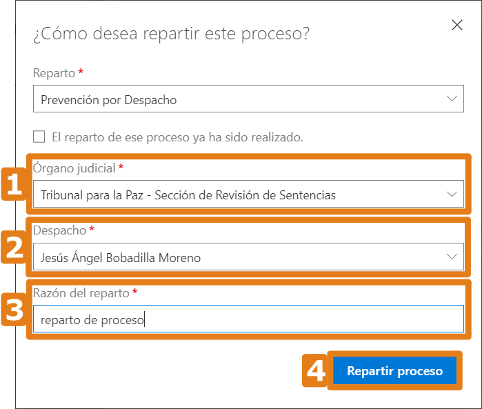 6. Los campos que tienen un asterisco rojo al lado deben completarse de forma obligatoria. Por lo tanto, complete los campos Órgano judicial (1), Despacho (2) y Razón del reparto (3). Para finalizar, haga clic en Repartir proceso (4).
