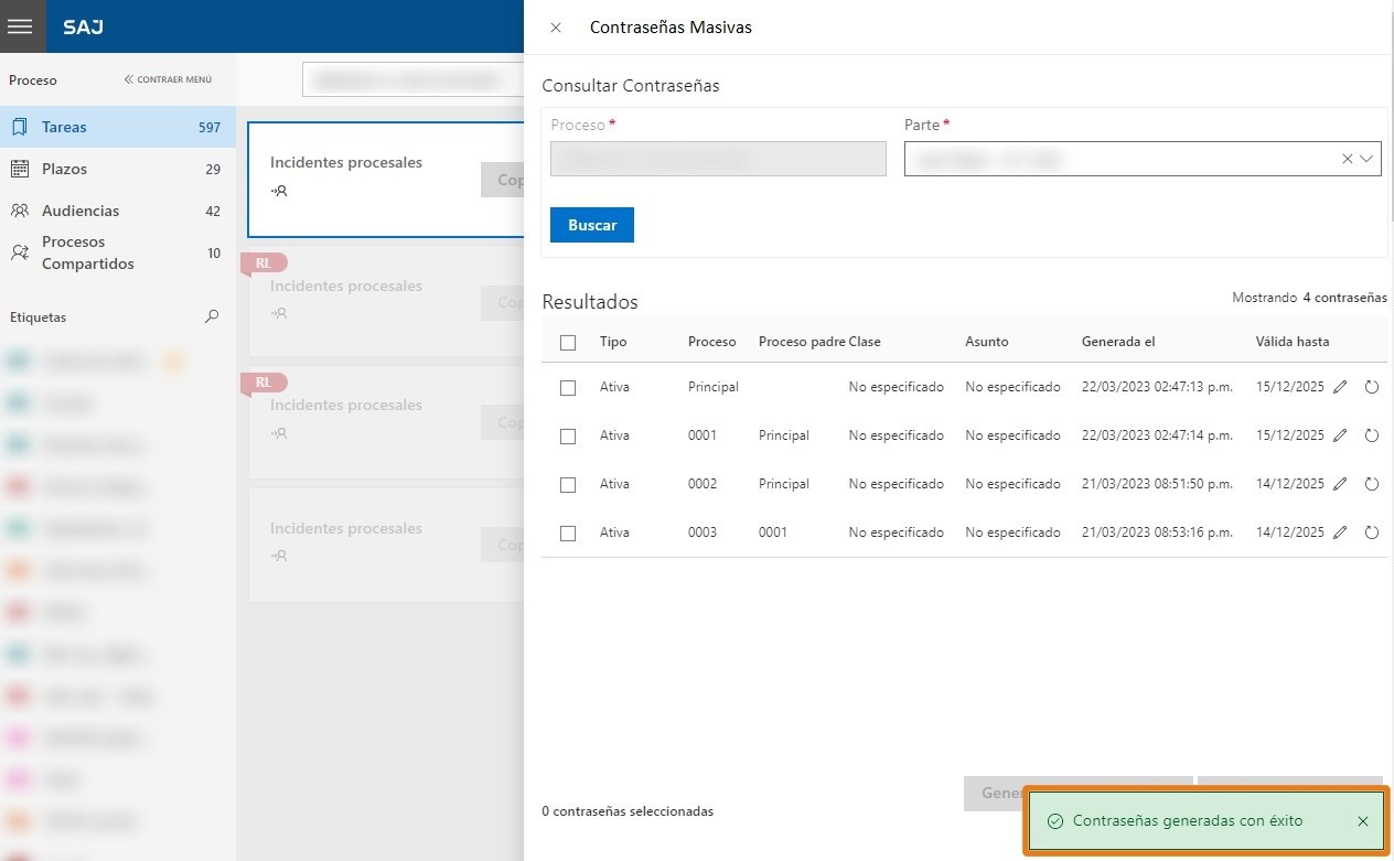 - Por medio de la pantalla de contraseñas masivas, en la cual se genera una contraseña para el proceso principal de la parte y una para el proceso dependiente vinculado al proceso principal;