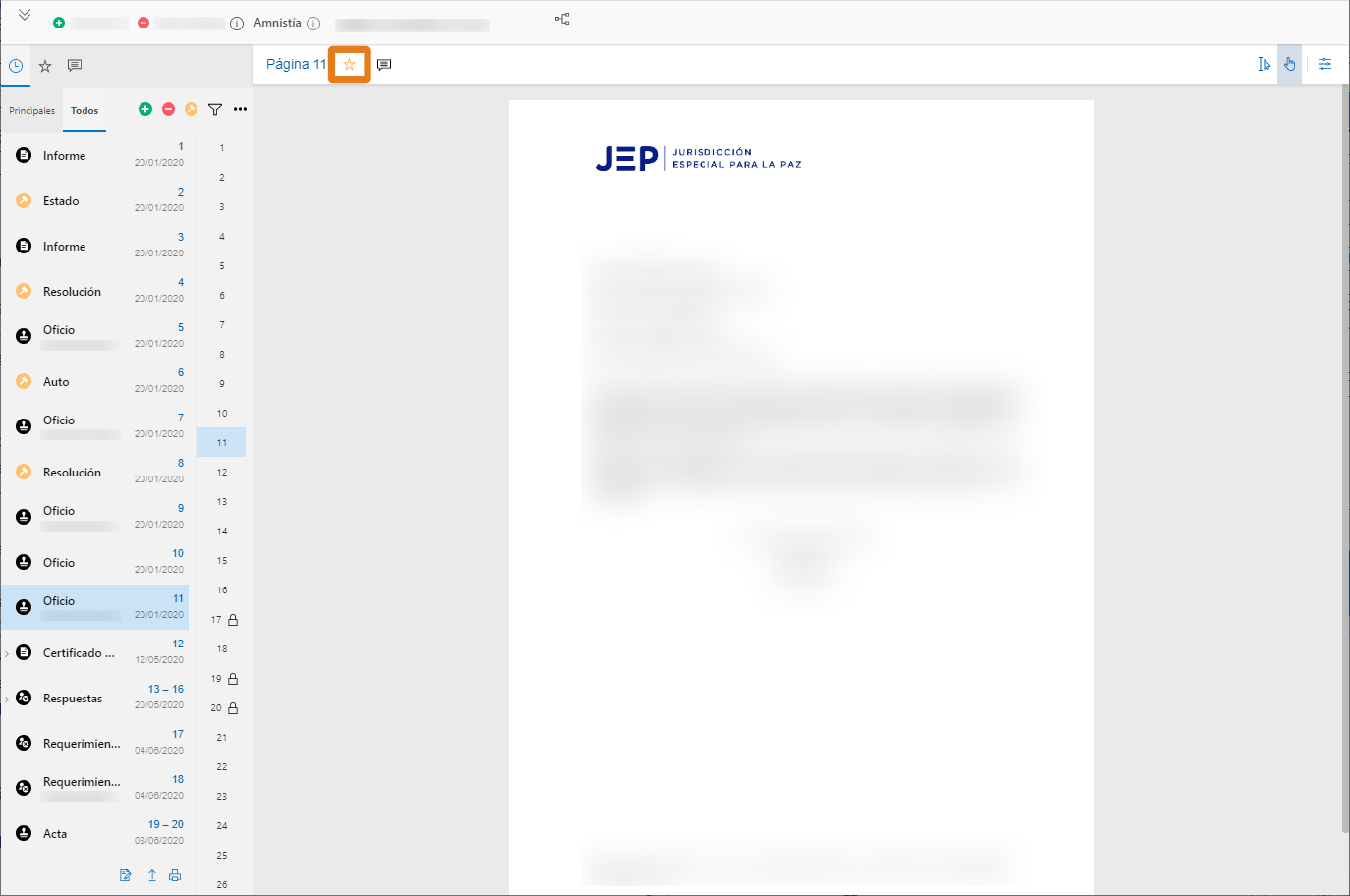 2. Para convertir una página de los documentos del proceso en favorita, con esta abierta, basta hacer clic en el ícono de la estrella