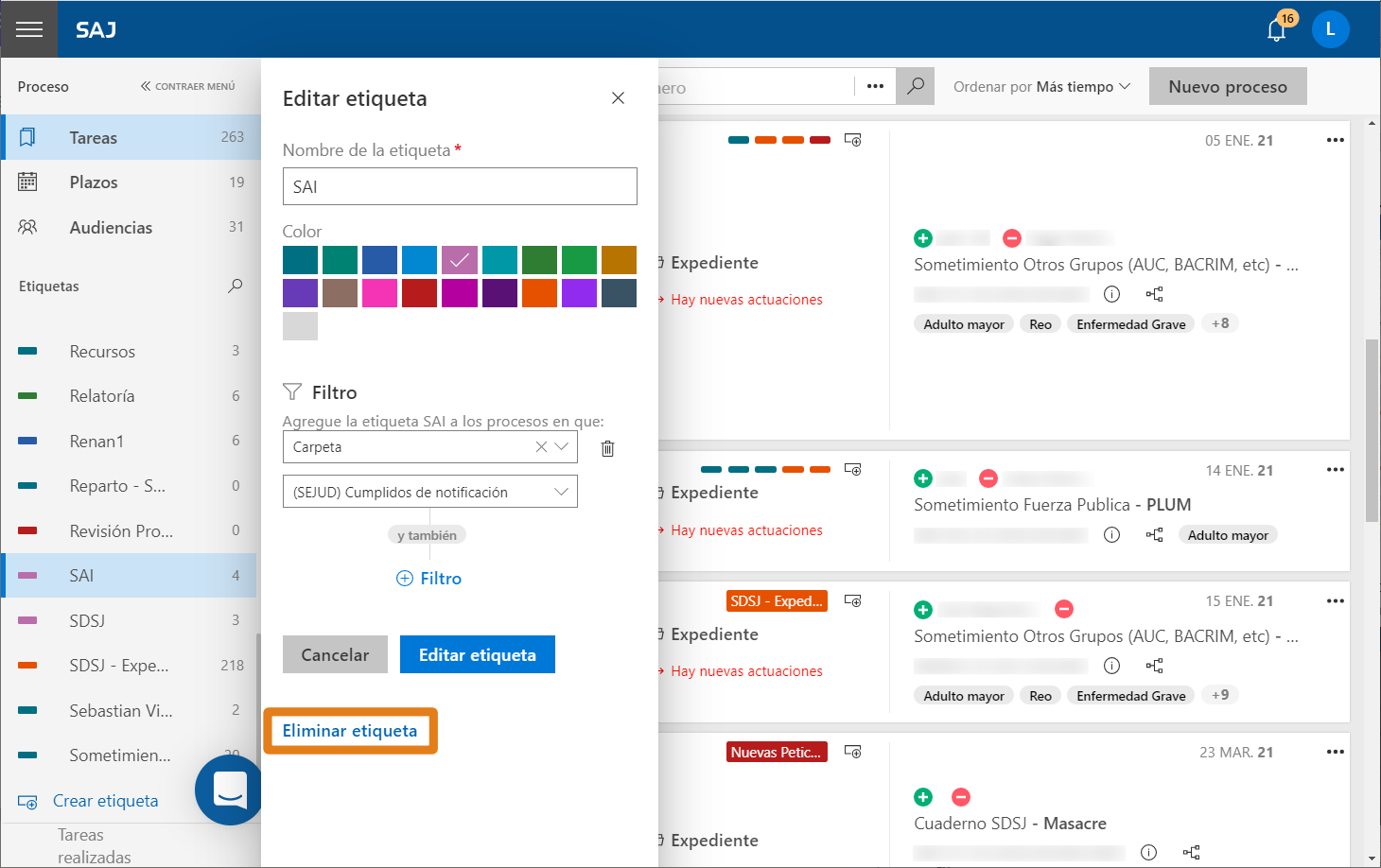 ¿Cómo desvinculo las etiquetas de un proceso en LEGALi?¡Listo! Es muy simple eliminar una etiqueta, ¿verdad? Aproveche esta funcionalidad de LEGALi.