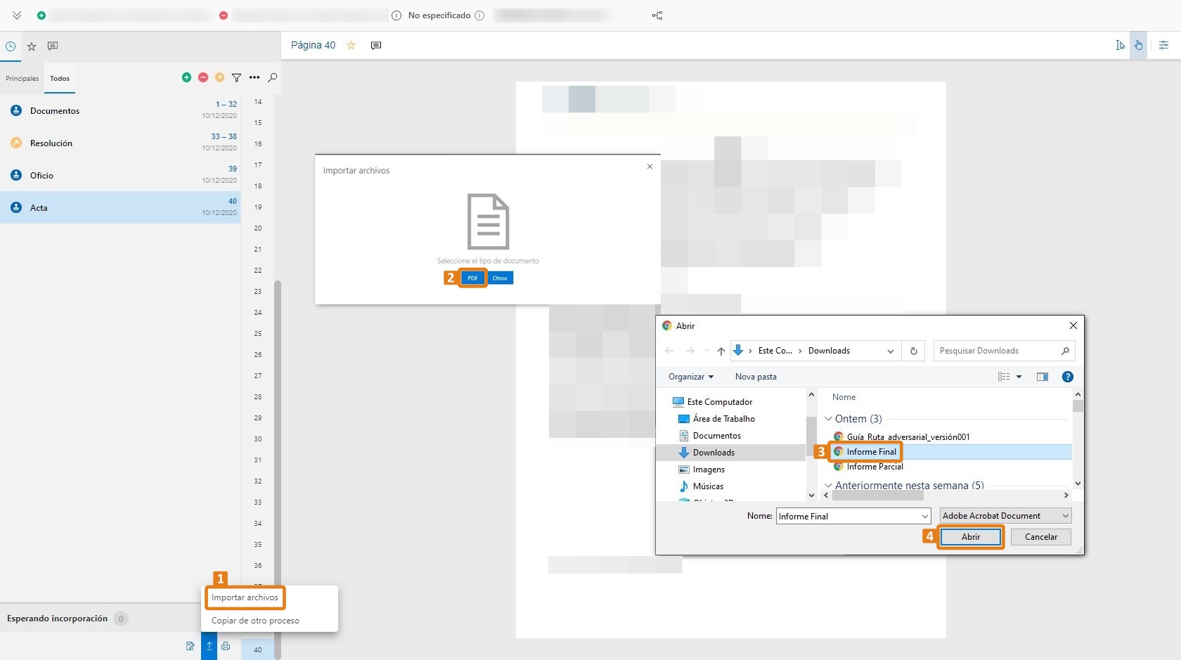 7. En la pestaña de archivos digitales que se abre, seleccione el icono en formato de flecha hacia arriba y seleccione Importar archivos (1). Después, en la ventana de importación de archivos, seleccione PDF (2). Entonces, en la ventana del computador, seleccione el documento (3) que desea incorporar y haga clic en Abrir (4).