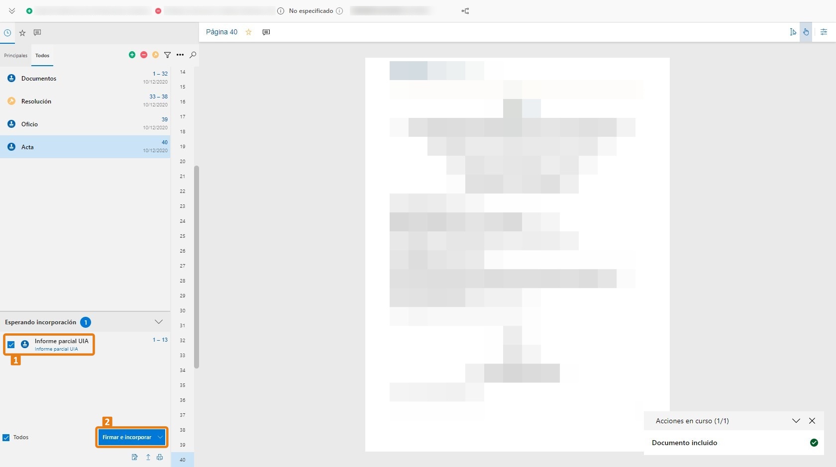 5. Después de indicar la actuación del proceso, seleccione el documento (1) y haga clic en Firmar e incorporar (2).