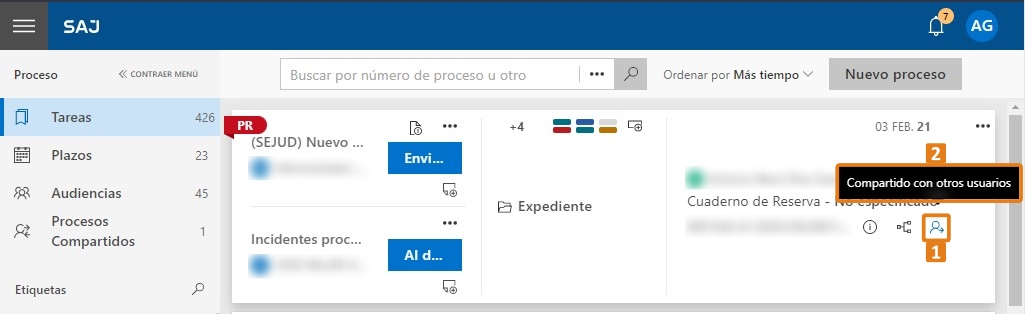 5. Al finalizar esta tarea, el card del proceso recibirá un nuevo icono (1). Al posicionar el cursor del ratón sobre este icono, se emite la información que identifica el proceso como compartido con otros usuarios (2) o con usted mismo.