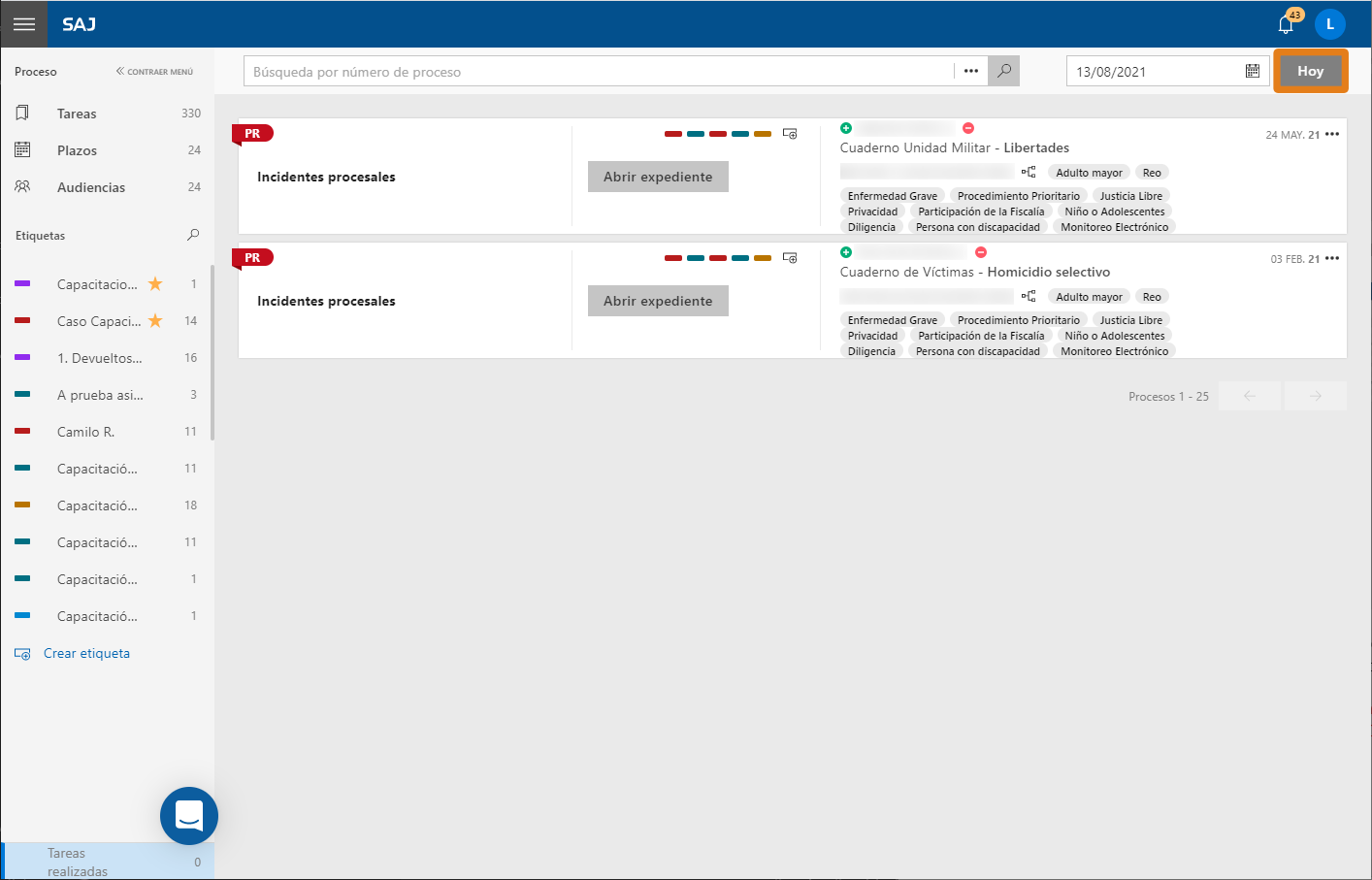 6. En la tarjeta del proceso se podrá visualizar la información de la carpeta en la que se realizó la actividad del proceso (1); el menú del proceso y la información sobre las partes; el número del proceso, la clase y el asunto y los procesos relacionados (3). Además, en el área central, también es posible abrir el expediente digital y visualizar las etiquetas del proceso (2).