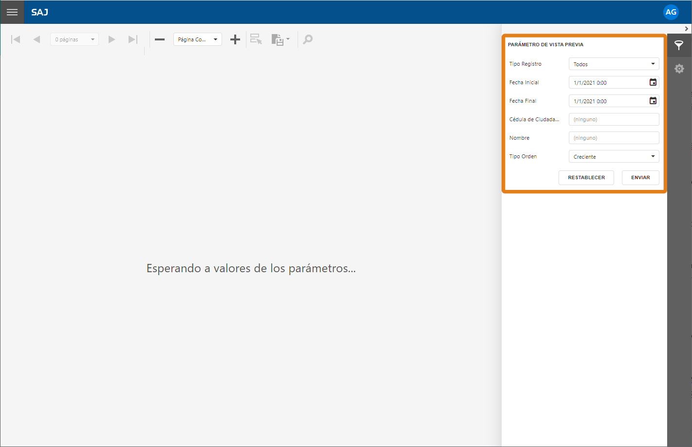 2. Se abrirá una nueva pantalla del sistema, específica para emitir este informe. A la derecha, verá algunas opciones de parámetros para diligenciamiento.