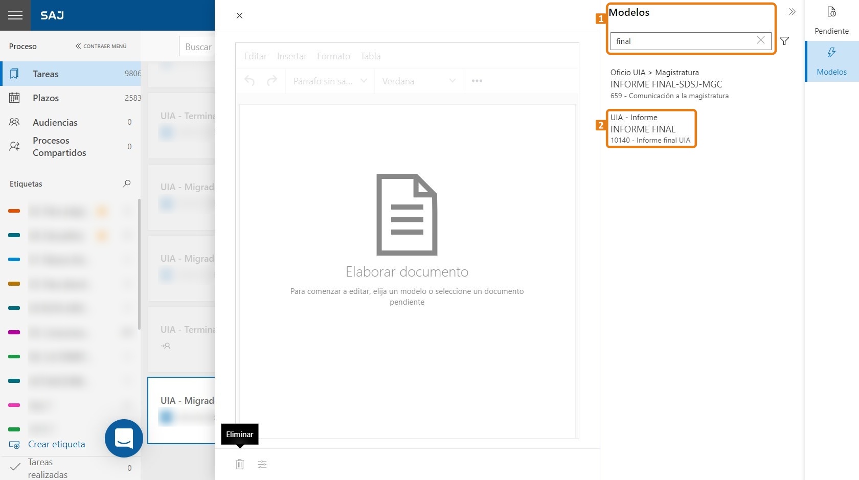 8. En la agrupación Modelos, haga una búsqueda a partir de la palabra "final” (1). Seleccione el modelo UIA – Informe Final (10140) (2).