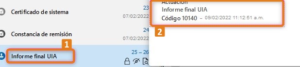 12. Una vez firmado e incorporado, el documento se vinculará a la comisión, generando la actuación Informe Final UIA (1) con código 10140 (2).