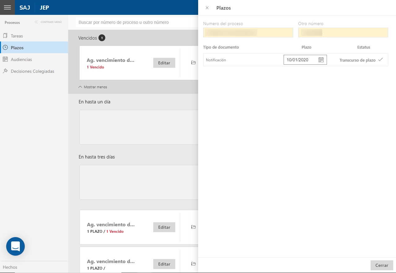 5. Después de confirmar el mensaje, el plazo se cierra y elimina de la lista de plazos pendientes, o sea, eliminado de la ventana de Plazos.