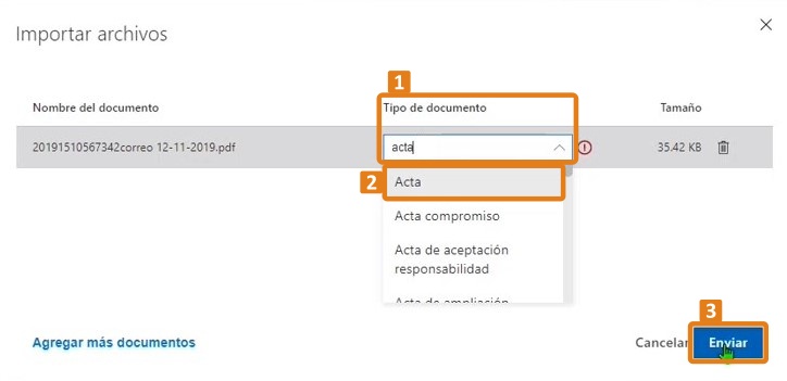 4. En el campo Tipo de documento (1) escriba “acta”, seleccione la opción Acta (2) y haga clic en el botón Enviar (3).