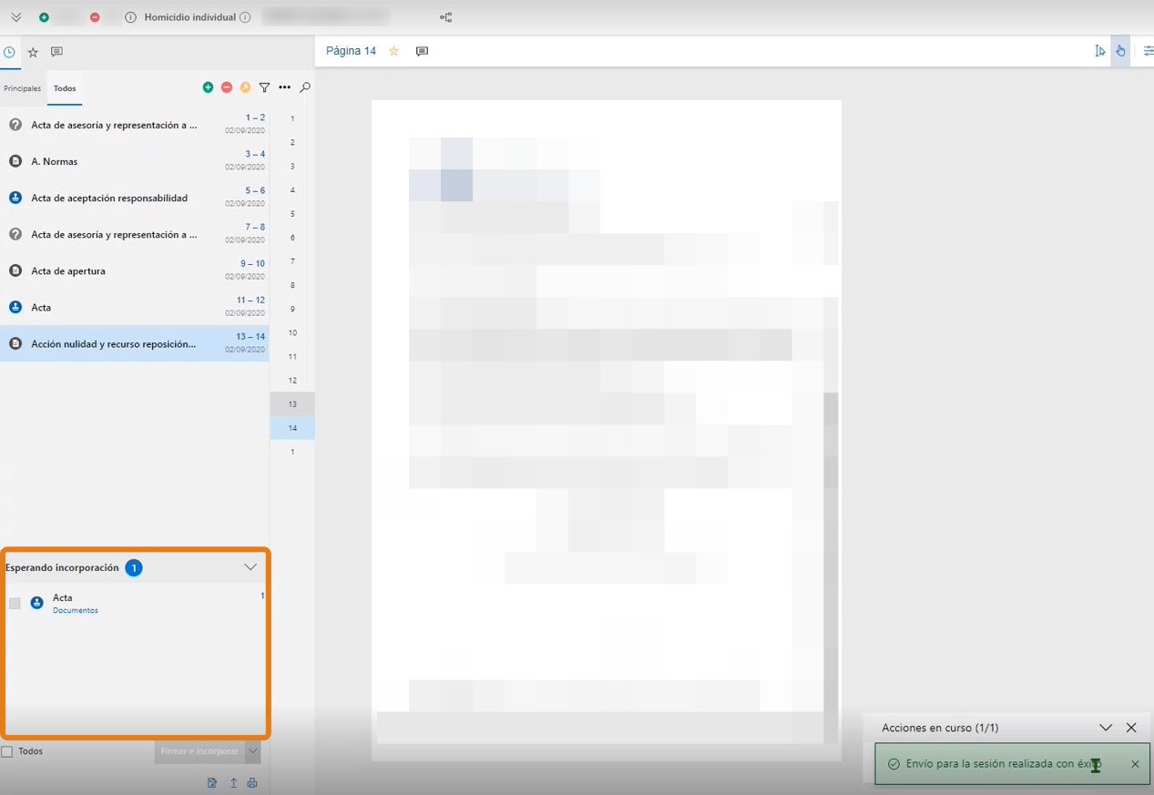 8. El sistema mostrará el mensaje "envío para la sesión realizada con éxito" y el documento permanecerá bloqueado en la agrupación Esperando incorporación.