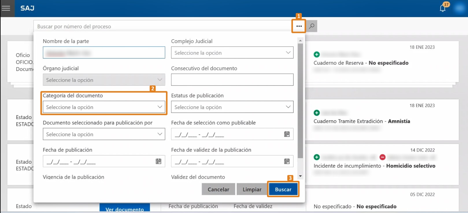3. El panel de Documentos publicables se carga. Haga clic en el botón de tres puntos (1) del campo de consulta. Enseguida, informe el Nombre de la parte (2) del proceso del documento que se envió a publicación y haga clic en Buscar (3).