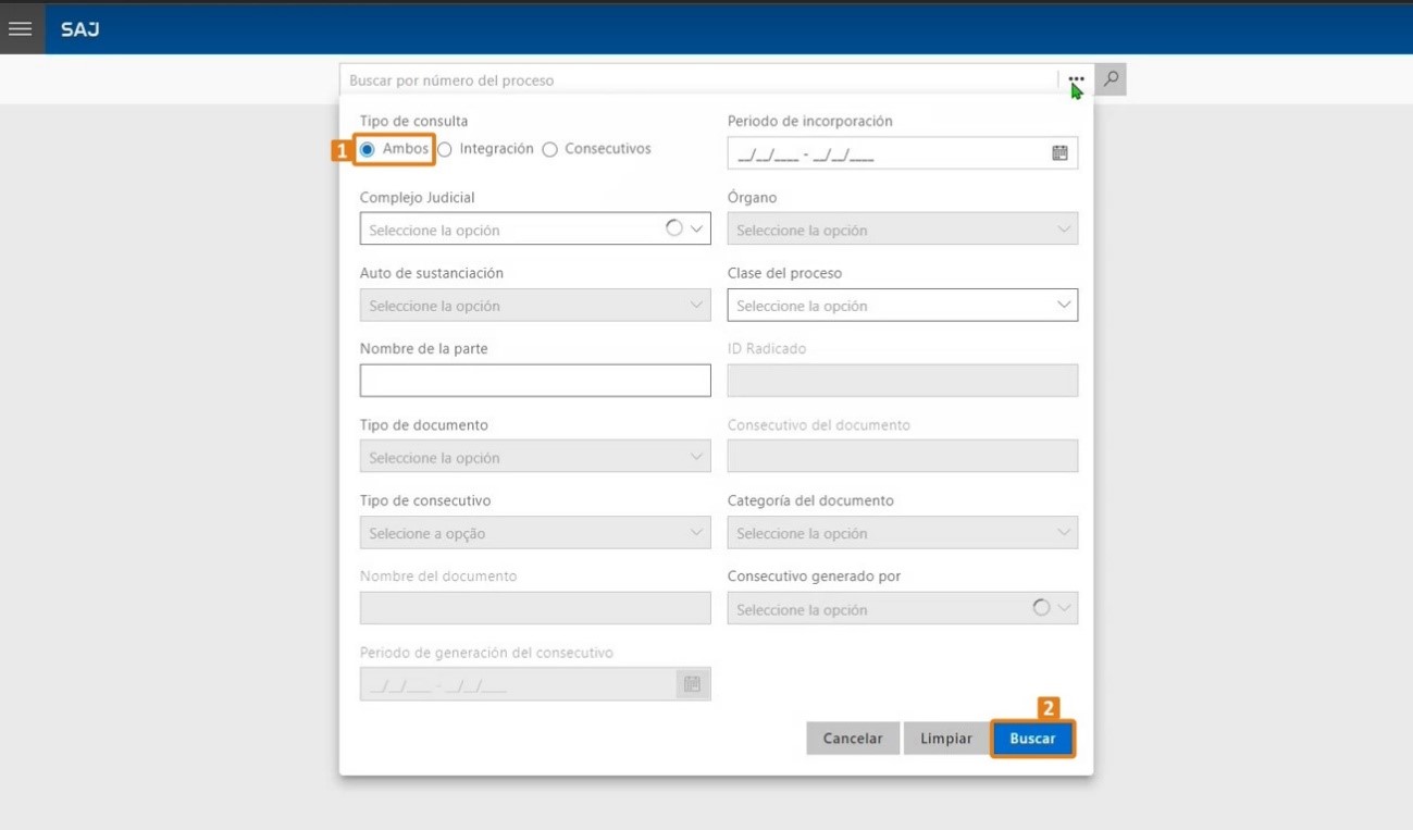 Se debe seleccionar la opción Ambos (1) y hacer clic en Buscar (2).